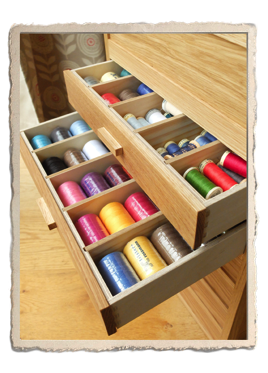 The drawers come with removable dividers so you can decide how to store your scissors, thread, accessories, haberdashery and other precious bits and bobs! There is plenty of space in the upper box for jars of buttons, patterns or quarters of fabric.
